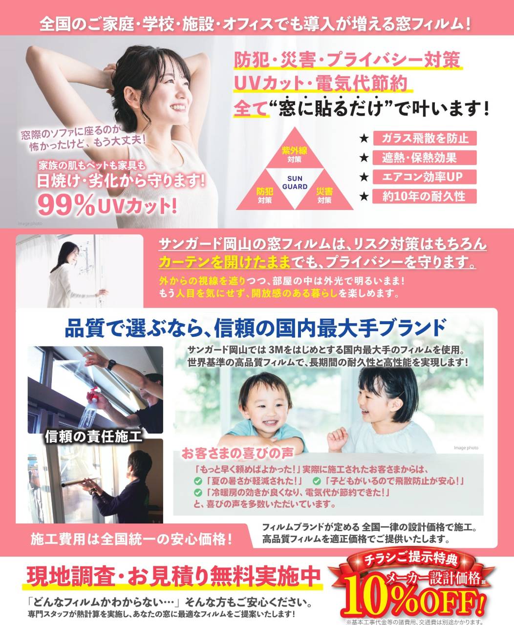 3M、サンゲツ、グラフィル等はもちろん、全メーカー各種ガラスフィルムを取りそろえ、経験豊富なガラスフィルム施工技能士が低価格かつ高品質の施工を実現します。
