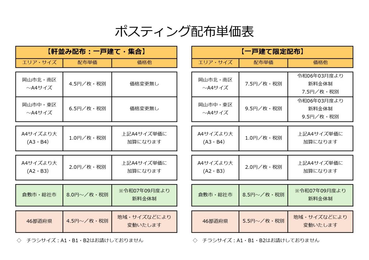 ※燃料費高騰に伴い、令和06年03月度より【一戸建て指定配布】の配布単価を「7.5円~*枚数」とさせて頂きます。 岡山ポスティングサービスの対応地域はその他に倉敷市・香川県・愛媛県・徳島県を設定しており、エリアごとに配布単価設定をしております。